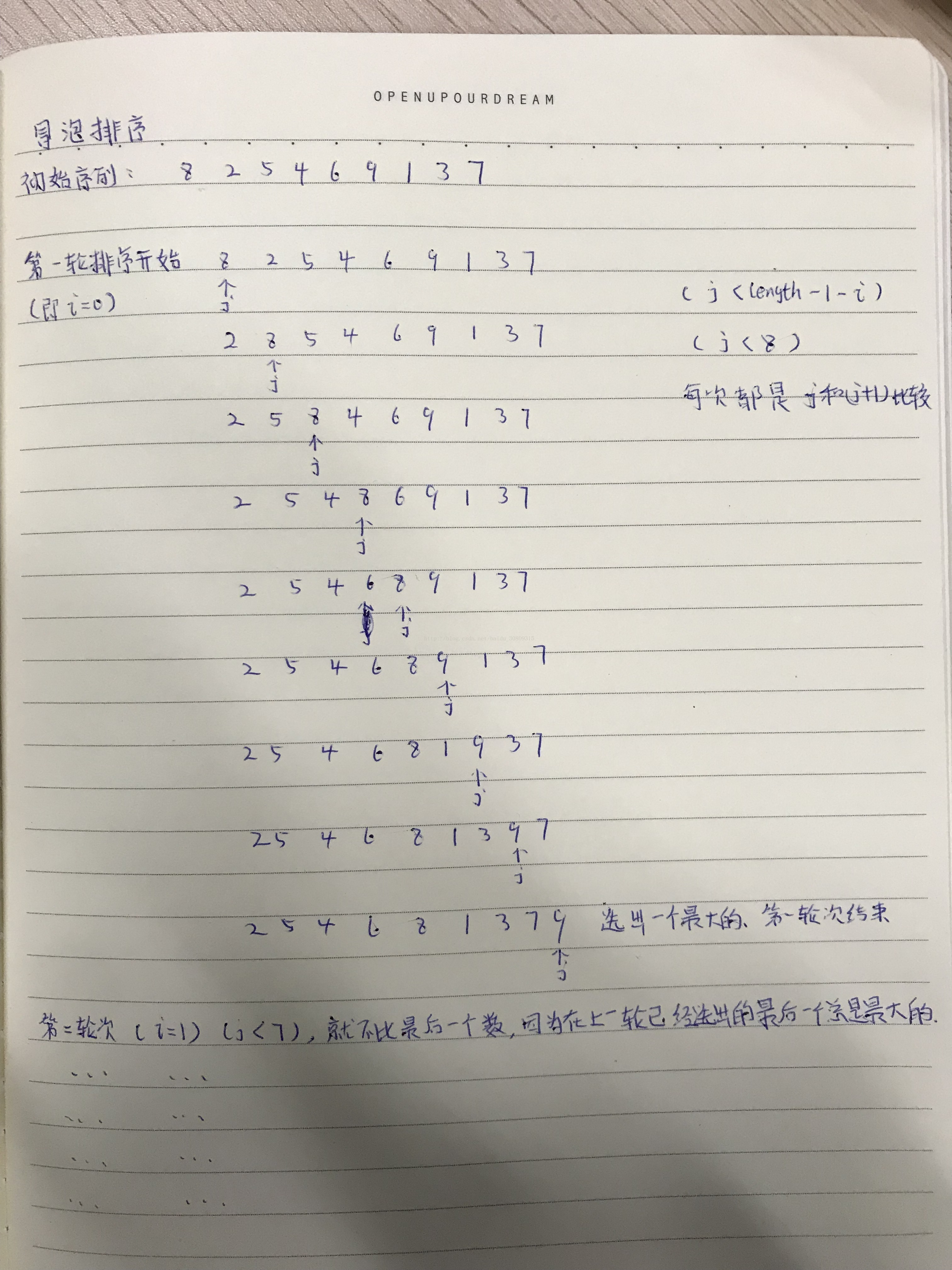 * n 个数字要排序完成,总共进行 n-1 趟排序,每 i 趟的排序次数为 (n-i) 次,所以可以用双重循环语句; | |