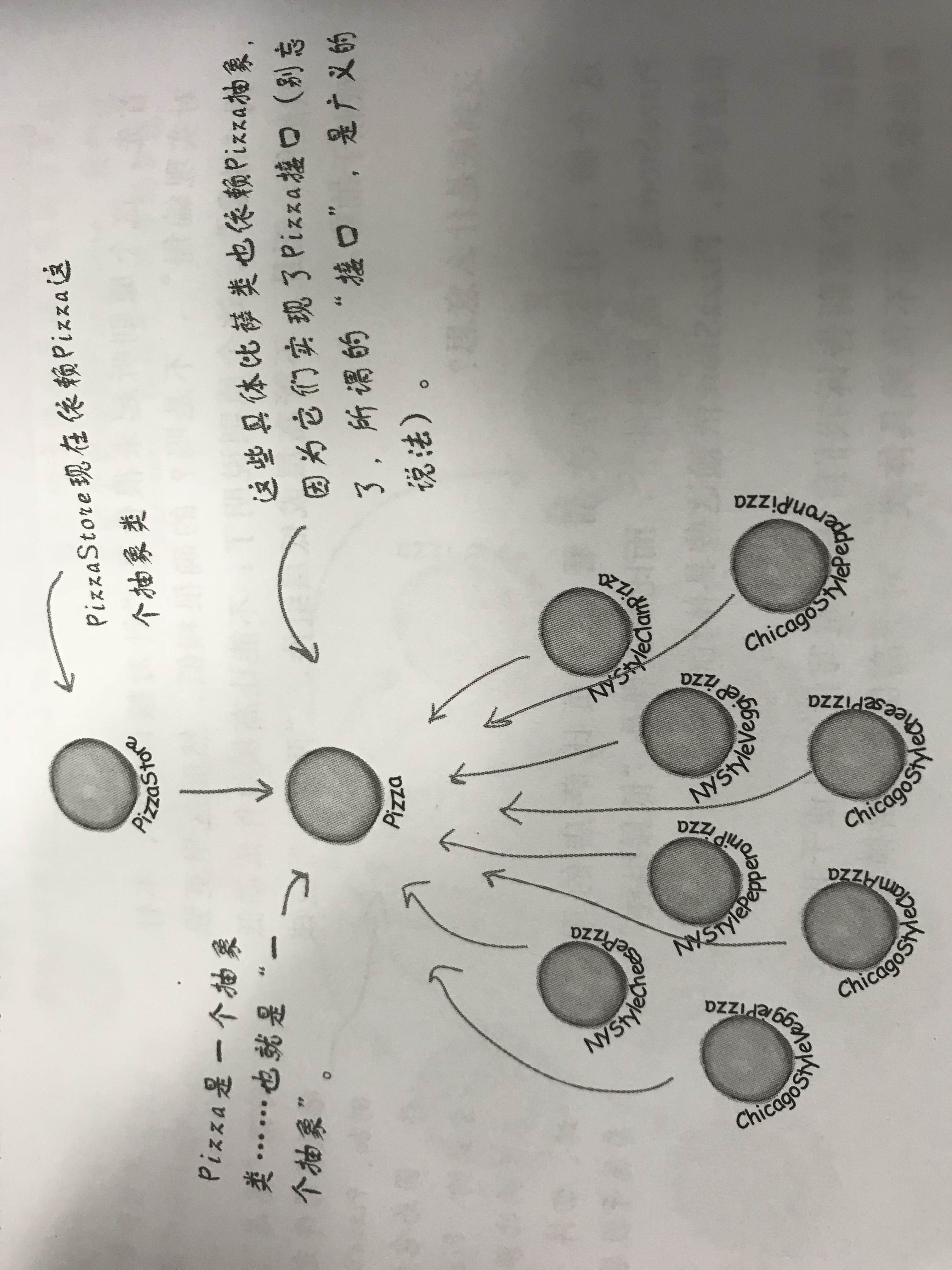 - 因为对于比萨具体实现的任何改变都会影响到 PizzaStore。我们说 PizzaStore 依赖于比萨的实现;