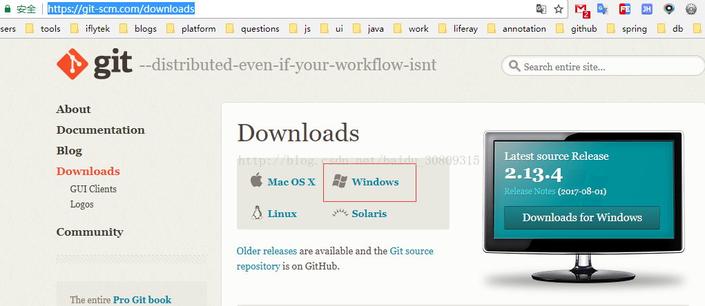 - 安装 git,首先去 git 官网下载 git,https://git-scm.com/downloads,下载.exe 格式并安装。