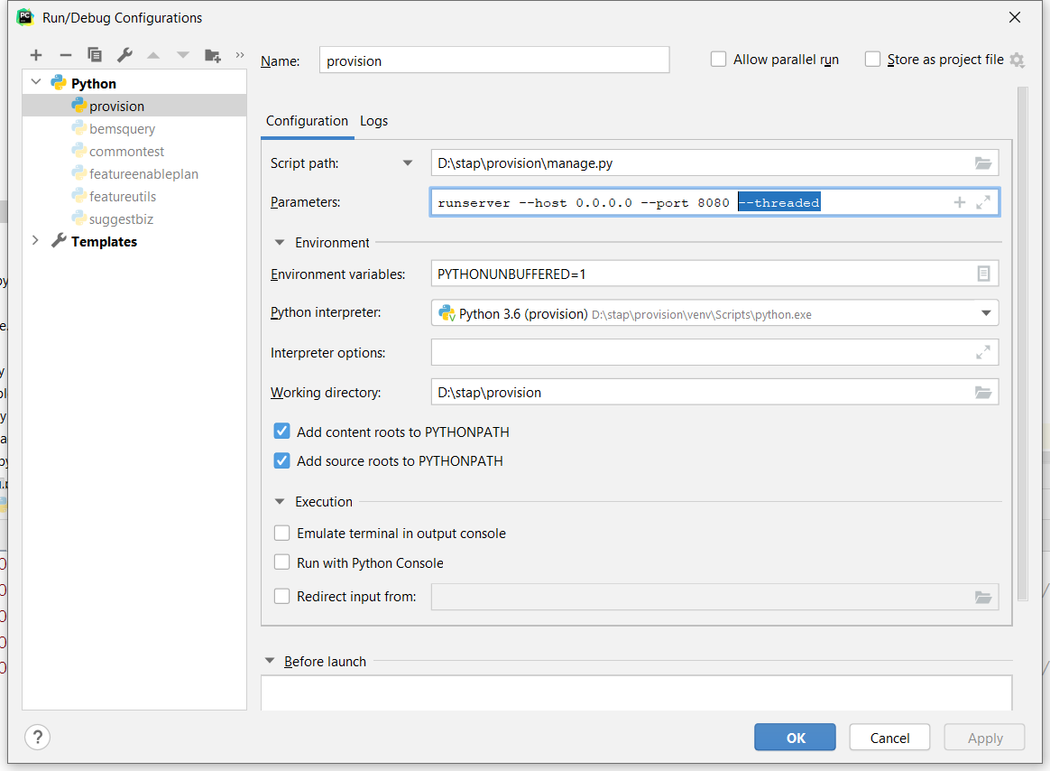 因此需要修改 pycharm Run/Debug Configurations 里的 Parameters 参数,加上 --threaded